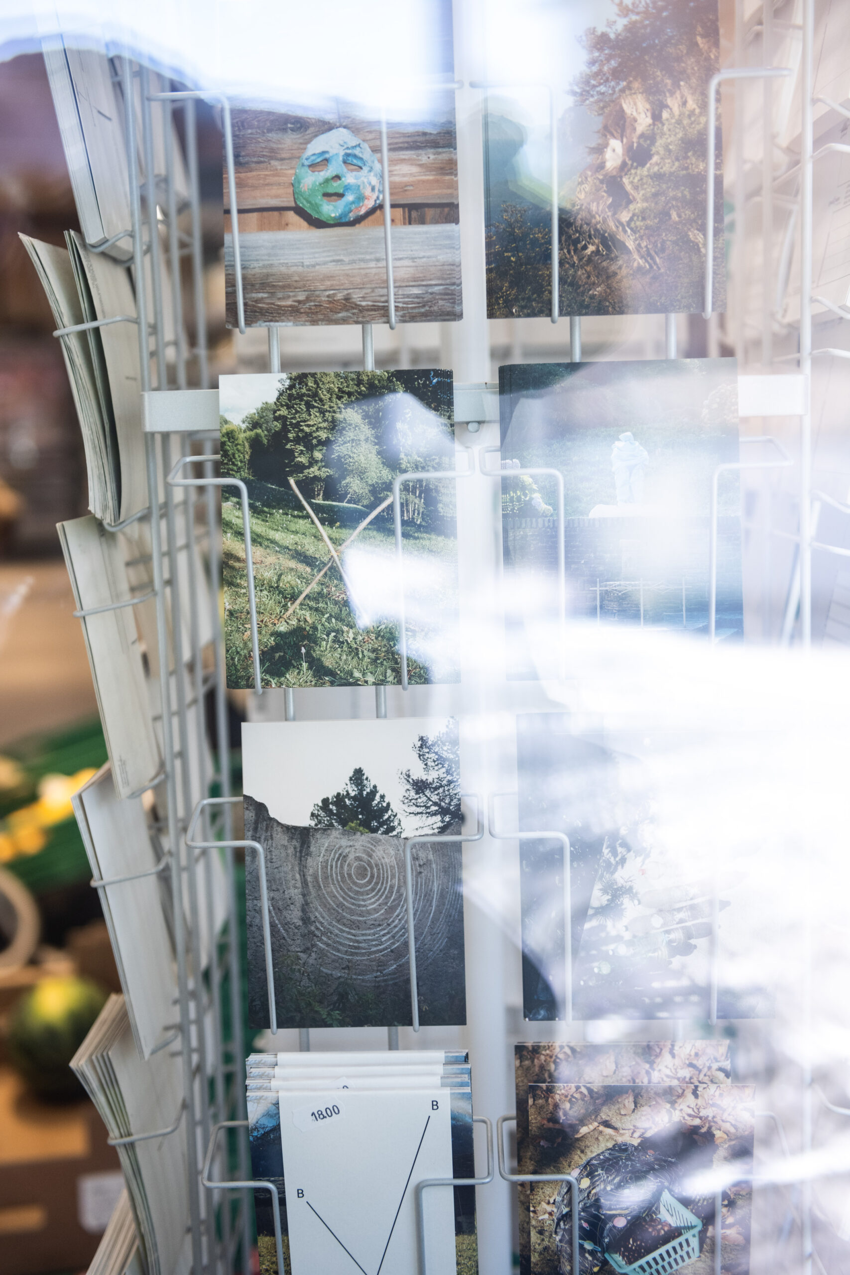 Einen ganz anderen Zugriff auf den Ort gibt es bei Jiajia Zhang und Jiří Makovec zu sehen: Die Arbeit des St.Galler Duos besteht aus einer 10-teiligen Postkartenserie mit Motiven, die die Künstler:innen im Bergell aufgespürt haben. Die Karten zeigen Spuren und Zeichen in der Landschaft – Markierungen und Fundstücke, natürliche oder menschgemachte.