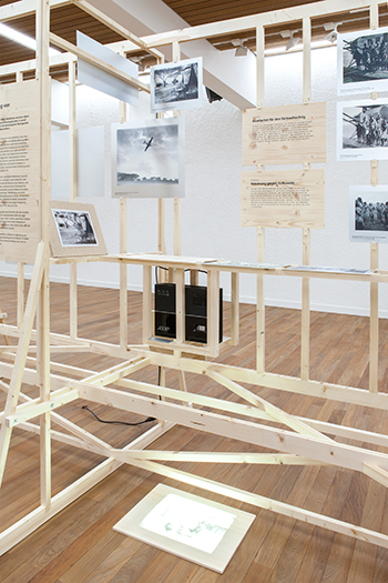 Das Holzgestell kann auf jeder Höhe bestückt werden: Schrift- und Bildtafeln ganz oben, halbhoch oder unten, horizontale Flächen als Arbeitstische, Bücher auf Augenhöhe, zuunterst Bildschirme mit Filmprojektionen. Man bückt sich, man streckt sich, man bleibt in Bewegung, wenn man sich alle Inhalte zu Gemüte führen will.