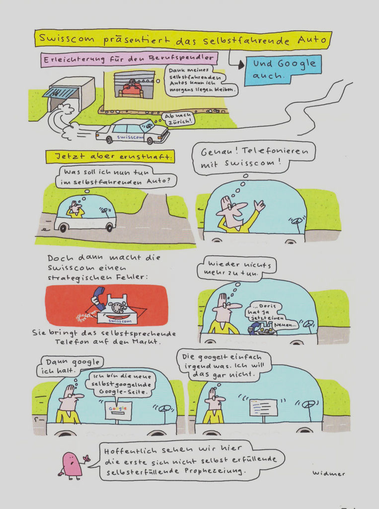 Die selbstfahrend und selbstredend schöne neue Welt der Autos und Telefone lässt den Widmer’schen Menschen mit seiner altmodischen Nase und dem liebenswürdig-verschreckten Blick alt aussehen. Oder die «Automatisierung des Firmenbesitzers» – in Robotergestalt klärt der Patron die «lieben Angestellten» darüber auf, dass er das Geld jetzt nicht mehr brauche, das sie erwirtschaften. Und diese, ebenfalls nette kleine Roböterli, geben brav zurück: «Wir wissen auch nichts damit anzufangen.».